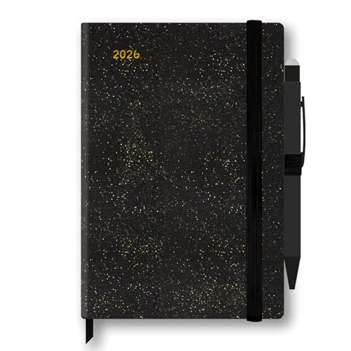 Cartomania Agenda 2026 Journalier M 12 mois noir pailleté, 12 x 18 cm, fermeture avec élastique, poche à soufflet, signet et stylo inclus