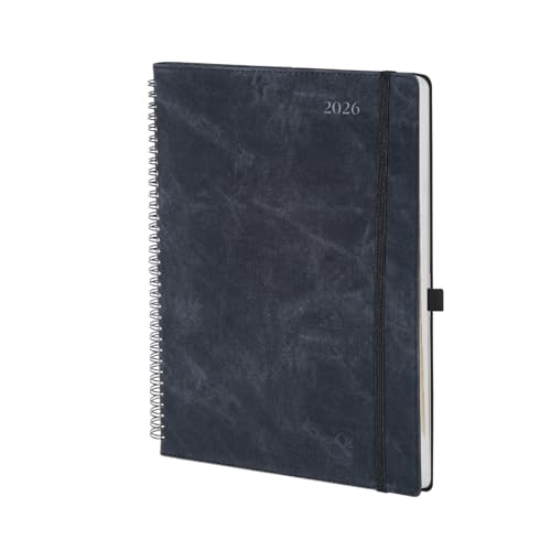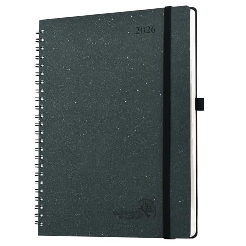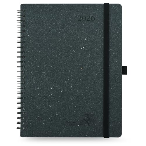 POPRUN Agenda 2026 Semainier Vertical 26,5 x 21,5 cm - Couverture rigide Spirale Écologique biodégradable, D'Jan 2026 à Déc 2026, Avec règle signet, Papier 80 g/m², Noir Gris