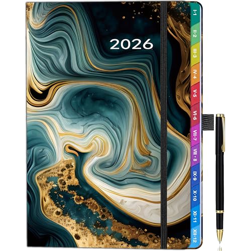 Agenda semainier A5 2026 – de janvier à décembre – Noir, design marbre, onglets mensuels colorés, porte-stylo élastique, 2 marque-pages, boucle stylo, pochette intérieure.