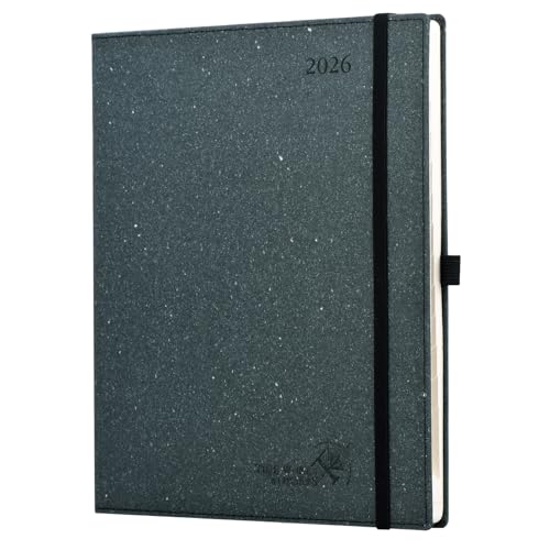POPRUN Agenda 2026 Semainier Vertical 26,5 x 21,5 cm - Couverture rigide Écologique biodégradable, D'Jan 2026 à Déc 2026, Avec signet à 2 rubans, Papier 80 g/m², Noir Gris