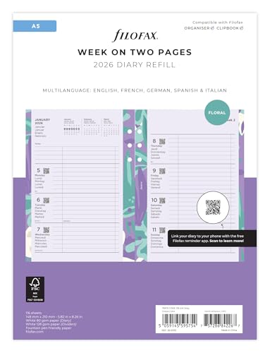 Filofax Agenda 2026 26-6351 A5 - Motif floral - Semaine sur 2 pages - 5 langues