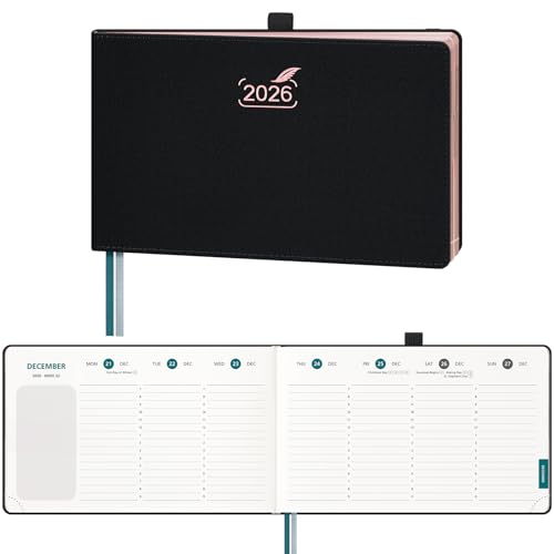 BEZEND Agenda 2026 Semainier 14 x 23 cm Vertical 1 Semaine 2 Pages avec Rose Gold Bord de Papier - Couverture Rigide en PU, Noir