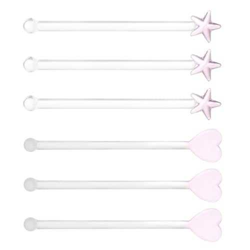 FRCOLOR Lot de 6 Bâtonnets de Mélange en Verre Transparent, Agitateur à Vin et Cocktail Motifs Étoile et Cœur Rose, pour Bar, Fête et Usage Domestique Réutilisable