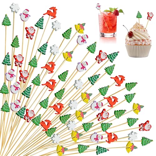 KASESSS 100 Pièces Pique Aperitif de Noël, 12cm Agitateur Cocktail, Cure Dent Bois Cocktail, Bâtonnets de Cocktail de Noël, Brochettes Cocktails pour Apéritifs Fruits Décoration avec 8 Modèles de noël