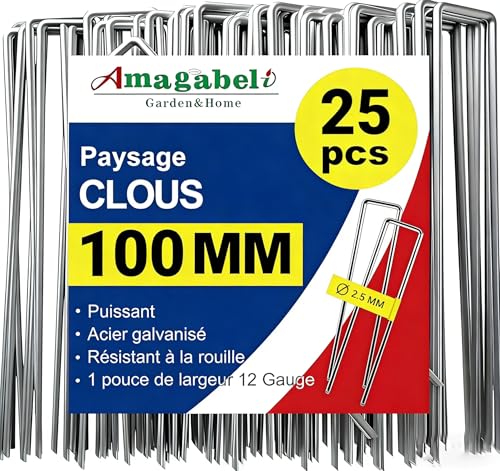 Amagabeli Garden Home 25 Piquets de Jardin Pelouse Agrafe Toile de Paillage en Forme de U - 100 mm Long - Ongles Mauvaises Herbes Tissu Piquets Galvanisé Piquet de Fixation en Acier pour Bache