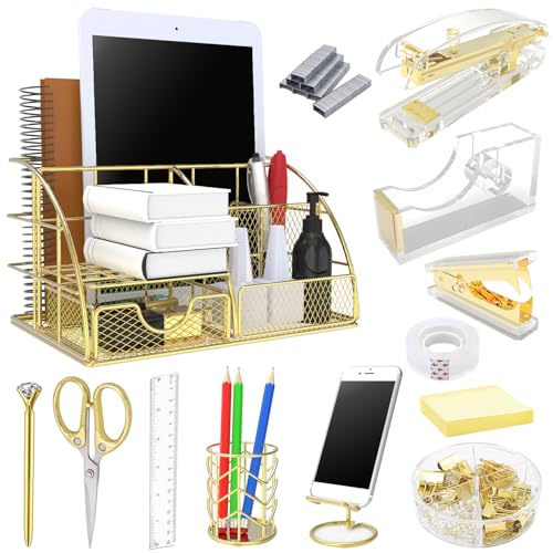 YOLOZAI Lot de 13 organiseurs de bureau pour fournitures et accessoires de bureau, agrafeuse, dégrafeuse, pinces, ciseaux, support de téléphone, stylo, porte-stylo, distributeur de ruban adhésif