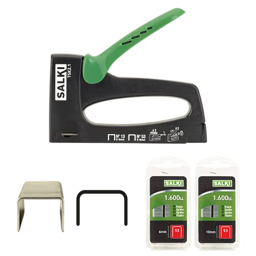 SALKI Pack Agrafeuse Murale Multifonction, Manuelle et Metallique - Outil pour Agrafer Câblage TSK2.1 avec Dispositif de Fermeture + 2 Blister de 1600 Agrafes n°53