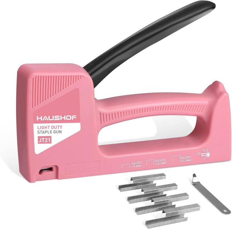 HAUSHOF Pistolet agrafeuse type 53 en plastique ABS avec extracteur d'agrafes et 800 agrafes de 8 mm pour bois, tissu, meubles et tapisserie - Rose