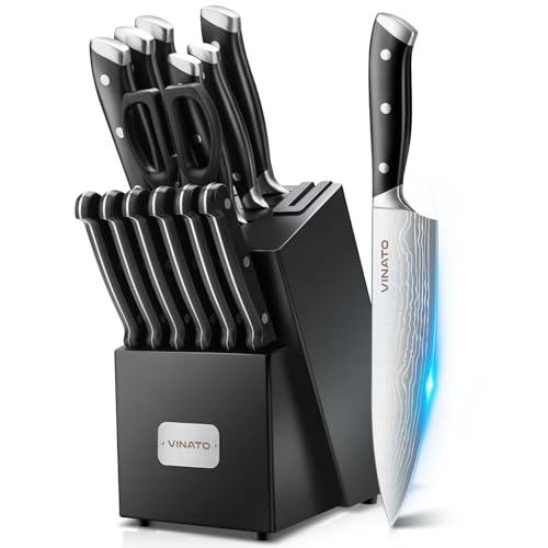 VINATO Couteau Cuisine, Couteau de Cuisine 14 Pièces avec Aiguiseur, Set de Couteaux de Cuisine Professionnels, Couteaux de Cuisine en Acier Inoxydable Tranchants avec Manche en Plastique