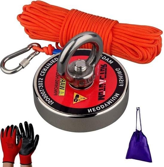 Aimant de Pêche Double Faces Aimant Néodyme Puissant 80mm Combiné Force de Traction 32KG+250KG avec Corde Tressée de 20M et Gants