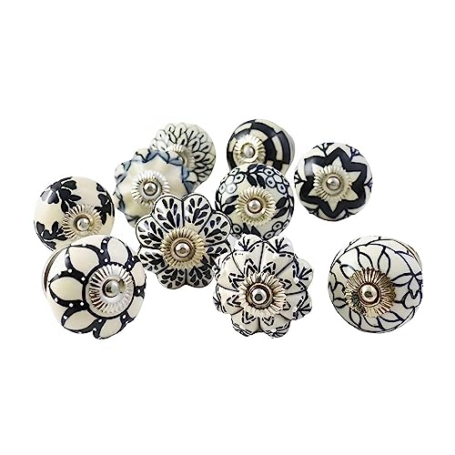 Ajuny Boutons en Céramique Peints à la main pour Portes de Placard Tiroirs et Meubles Poignées de Cuisine Finition Brillante Floral Bouton (Blanc et Noir, Lot de 10)