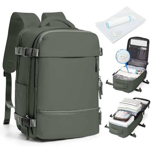 SZLX Sac à Dos de Voyage Sous Vide Avec Pompe à Vide, Sac à Dos Airbag Bagage à Main Femme, Ryanair Travel Ruscksack Taille de Cabine avec Pompe étanche Valise à Vide pour Hommes Vert olive