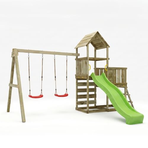 Aire de jeux en bois Maxplay 2.2 avec toboggan 2,2 m vert, double balançoire, tour avec toit et mur d'escalade – aire de jeux de jardin pour enfants 3-10 ans, bois imprégné Autoclave (rouge)