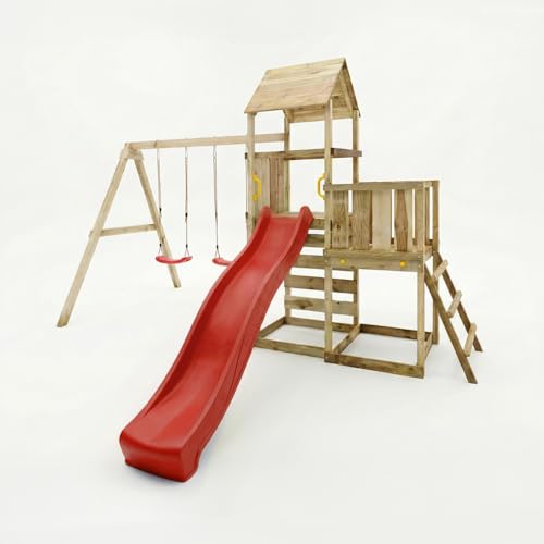 Aire de jeux en bois Maxplay 3.1 avec tour à 2 plates-formes, toboggan 2,2 m, double balançoire et escalade – aire de jeu de jardin avec sable, 356x395x262 cm, bois Imprégné Autoclave (Rouge)