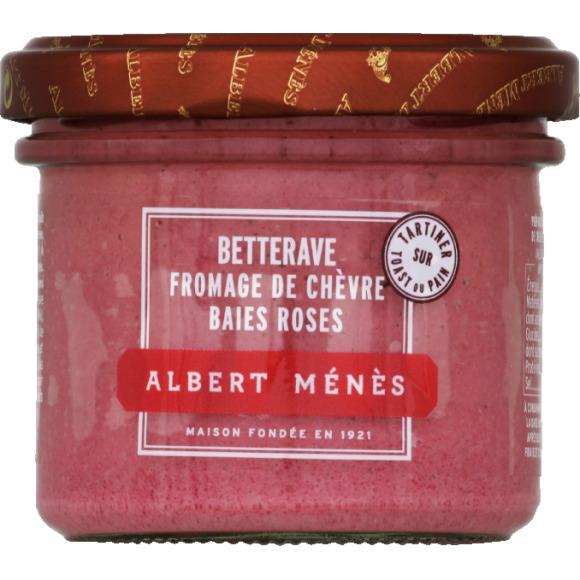 Préparation à base de betterave, fromage de chèvre, baies roses, pour tartiner sur toast