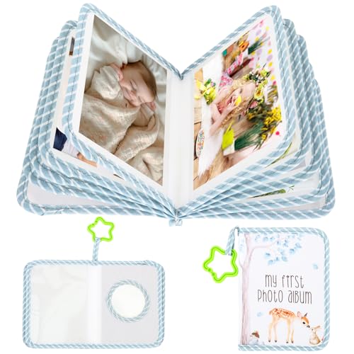 MIMEITOPA Album Photo de bébé, pour Livre de Souvenirs de bébé avec Pochettes Photo Transparentes, Crochet de Suspension, Miroir de sécurité, Couverture en Tissu Doux,