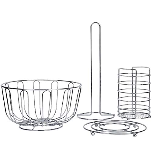 axentia 4 Pièces Ensemble d'Ustensiles de Cuisine en Métal, Corbeille à Fruits, Support à Couverts, sous-Verre et Support de Papier Essuie-Tout, Argenté
