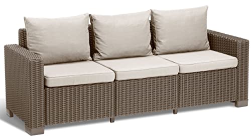 Allibert by Keter California Canapé de Jardin 3 Places Cappuccino/Sable avec Coussins d'assise et de Dossier, en Plastique, Aspect rotin, 199 x 68 x 72 cm