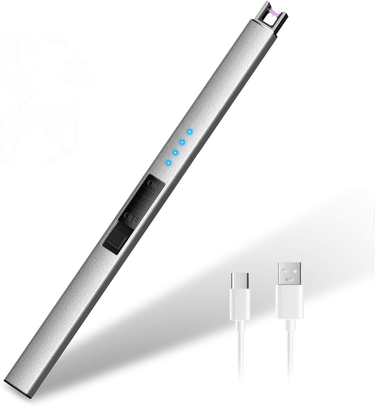 HOTERB Allume Bougie Électrique USB Rechargeable, Briquet Arc Électrique Coupe-Vent Long Avec Port Type C pour Bougie, Gazinière, Barbecue (Argent)