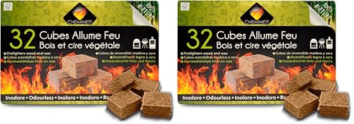 Cheminett - Cubes Allume Feu Naturels - 32 Pièces - À Base de Sciure de Bois de Conifères Certifié FSC et d’Huile Végétale - Temps de Combustion 8 à 10 Min (Lot de 2)
