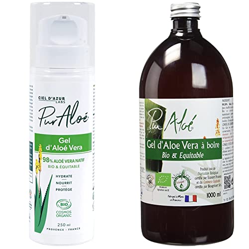 Ciel d'Azur Labs - Gel d'Aloé Vera Bio Pur Aloé - 98% Aloé Vera Natif Bio & Équitable - Visage et Corps - Certifié Bio Cosmos Organic - Flacon 250 ml & Aloé Vera Bio Pur Gel à Boire, 1000 ml, 1 Unité