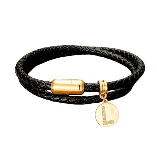 HUIANGLIYG Bracelet En Cuir Avec Initiale Pour Homme Et Femme. Bracelet Alphabet Noir En Cuir Avec Fermoir Magnétique. Bijou Cadeau Pour Papa, Mari, Frère, Petit Ami, Fils. Diamètre : 21 Cm.