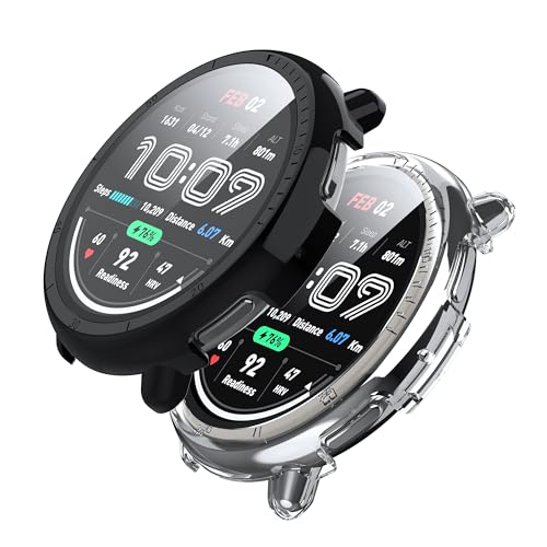 Fitudoos [2 Pièces PC Coque Compatible avec Amazfit Active 2,Coque Rigide en PC avec Protection d'écran en Verre trempé,Iégère Anti-Chute Haute Sensibilité Protection,1 Noir + 1 Transparent