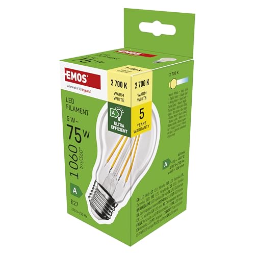 EMOS Ampoule LED Edison A60, 5 W de remplacement pour ampoule à incandescence de 75 W, classe A, ampoule vintage avec culot E27, luminosité 1060 lm, blanc chaud 2700 K, durée de vie extra longue 50