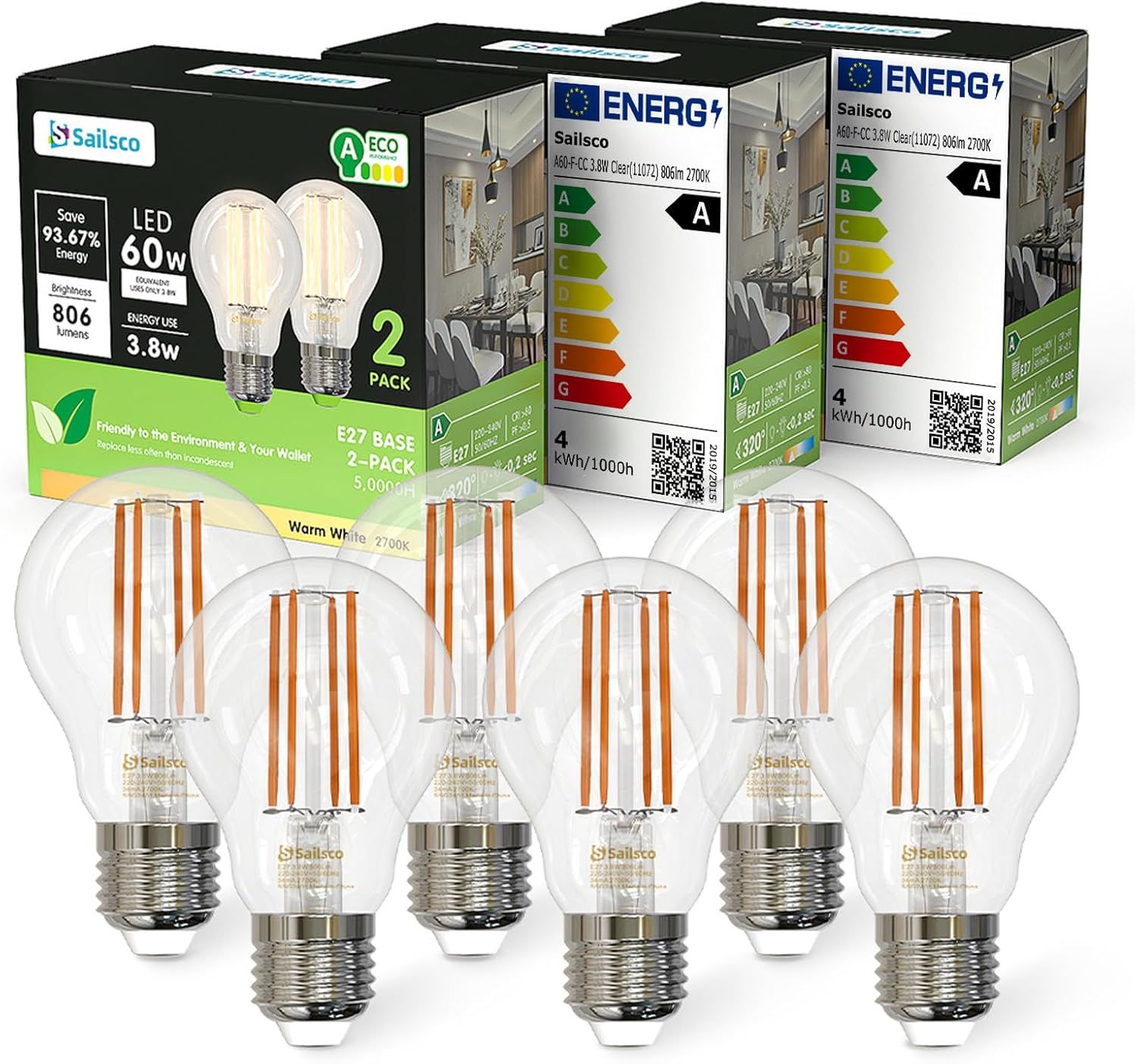 KALSW-Classe A Ampoule Led Filament Standard E27 A60,3.8W Equivalent À Ampoule Incandescence 60W,806Lm 2700K Blanc Chaud Claire Verre,Ampoule Edison Vintage,Non Dimmable,Lot De 6