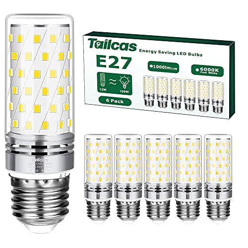 Tailcas Ampoules Led E27 Blanc Froid, 12W (Équivalent Halogène 100W) Ampoule Culot Edison à vis E27 6000K 1000LM Non-Dimmable Sans Scintillement AC 220-240V pour Lustres, Lampe de table (Lot de 6)