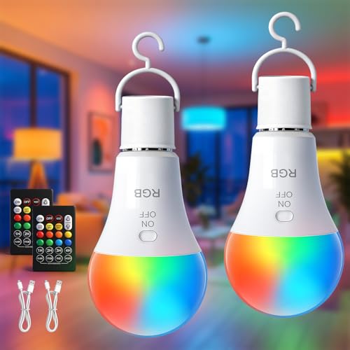 Kambo E27 LED RGB Ampoule, Rechargeable, avec télécommande, 7W intensité variable, Changement de couleur, Fonction de minuterie, pour camping en plein air, Noël, 2 pièce