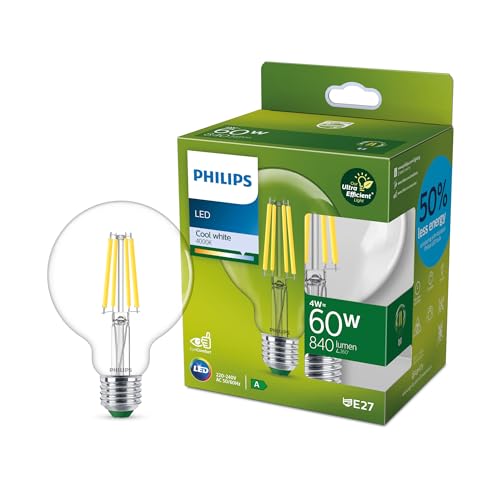 Philips ampoule LED Ultra Efficient Classe A, 60W, format globe, culot E27, blanc froid 4000K, transparente