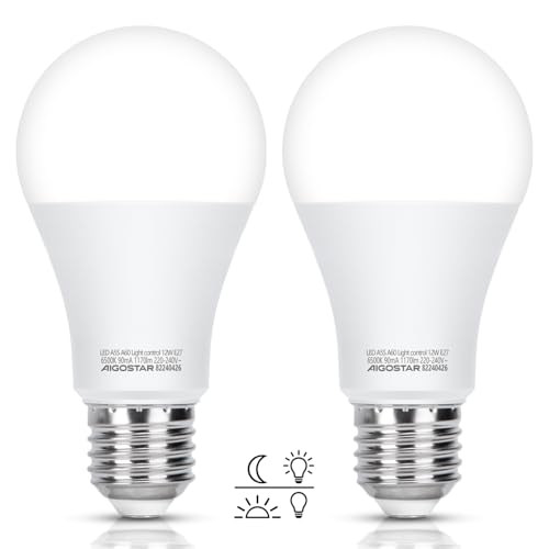 Aigostar Ampoule LED Crepusculaire E27 12W, Ampoules LED à Capteur Crépusculaire, Blanc Froid 6500K, 1170 Lm, Ampoule Allumage Automatique pour Garage Couloir Cave Escaliers, Lot de 2