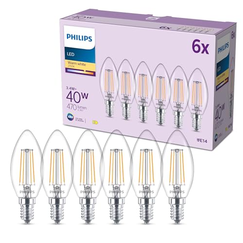 Philips Ampoule LED, Pack de 6, B35, E14, 470 Lumens, 40 W, Design Flamme, Longue Durée de Vie, Lumière Blanc Chaud 2700 K, Ampoule Transparente