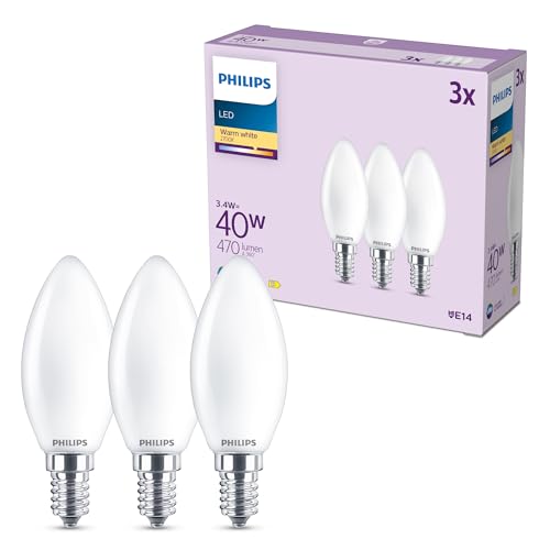 Philips Ampoule LED, Pack de 3, B35, E14, 470 Lumens, 40 W, Design Flamme, Longue Durée de Vie, Lumière Blanc Chaud 2700 K, Ampoule Dépolie