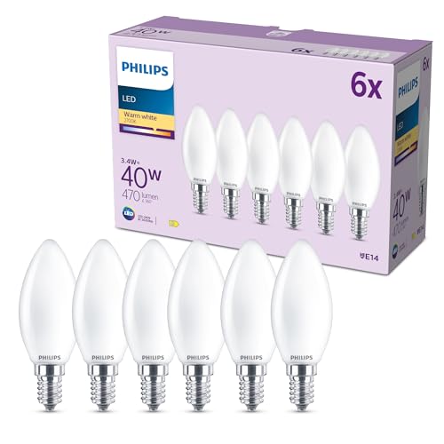 Philips Ampoule LED, Pack de 6, B35, E14, 470 Lumens, 40 W, Design Flamme, Longue Durée de Vie, Lumière Blanc Chaud 2700 K, Ampoule Dépolie
