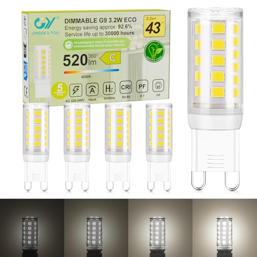GY Ampoule Dimmable G9 LED Blanc Neutre 4000K, 3.2W 520LM Equivalent 43W, G9 Classe C, 360 Degrés, 220-240V, Luminosité Réglable, Lot de 5