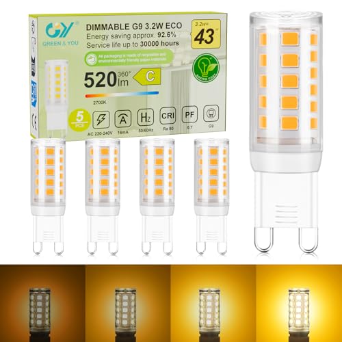 GY Ampoule Dimmable G9 LED Blanc Chaud 2700K, 3.2W 520LM Equivalent 43W, G9 Classe C, 360 Degrés, 220-240V, Luminosité Réglable, Lot de 5