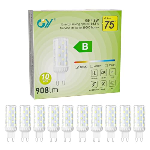 GY Grosse Ampoule G9 Led Blanc Chaud 3000K, 4.9W 908LM Equivalent 75W, Classe B d'Efficacité Énergétique, 23mm x 66mm, 220-240V, Non-Dimmable, À éviter dans les espaces réduits, Lot de 10