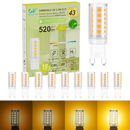 GY Ampoule Dimmable G9 LED Blanc Chaud 2700K, 3.2W 520LM Equivalent 43W, G9 Classe C, 360 Degrés, 220-240V, Luminosité Réglable, Lot de 10
