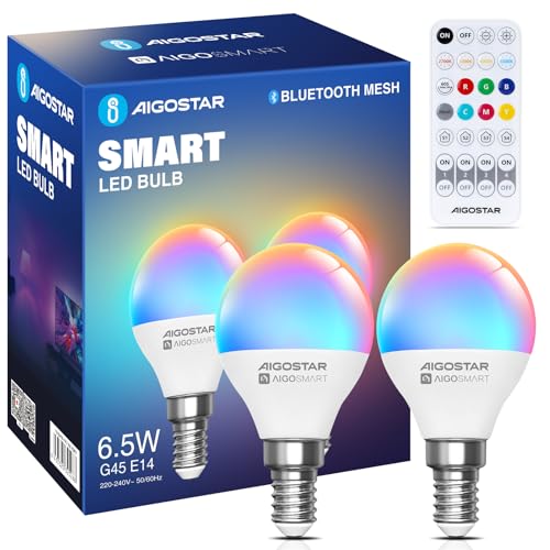 Aigostar Mesh - Ampoule Connectée Bluetooth Mesh G45 6.5W, Ampoule Connectée Alexa E14 LED 555LM RVB & 2700K-6500K, 16 Millions de Couleurs, 4 Unités (avec Télécommande Bluetooth)