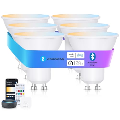 Aigostar Mesh - 6.5W GU10 Ampoule Connectée Bluetooth Mesh, Ampoule Connectée Alexa 555LM RVB & 2700K-6500K, Ampoule LED Alexa, 6 Unités (avec Passerelle et Télécommande Bluetooth)