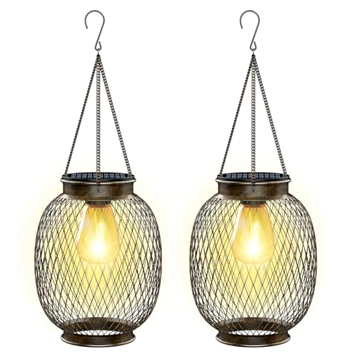 Liuyife 2 Pièces Lampe Solaire Exterieur Jardin Suspendue, Métal Lanterne avec Ampoule LED, Avec Crochet et Chaîne, IP65 Étanche Lanterne Solaire à LED pour Terrasse Balcon Cour Decoration