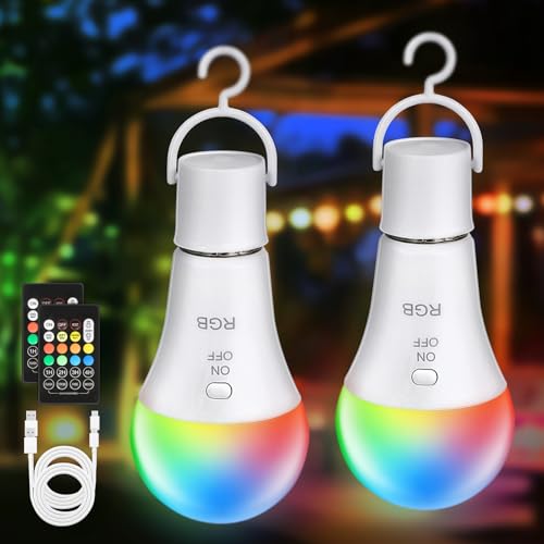 Pulsky Ampoule rechargeable RVB USB-C avec minuterie télécommandée et 12 températures de couleur,7W Dimmable Battery Powered Light Bulbs for Non Hardwired Lamps, Applique murale, maison, camping