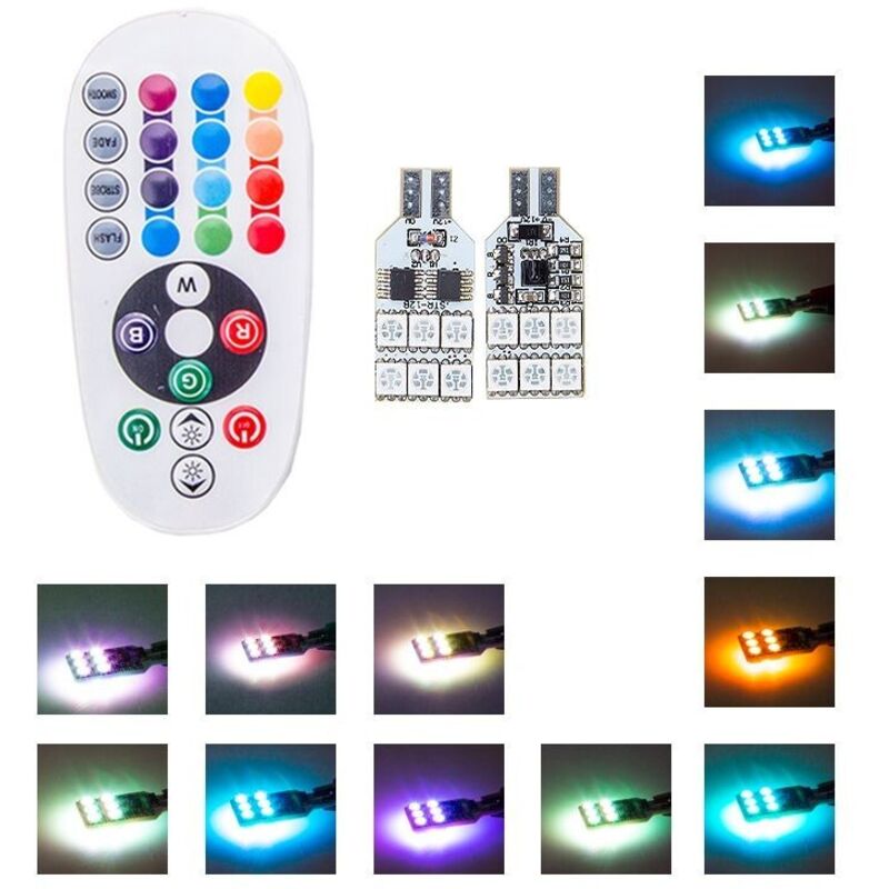 Lot de 2 ampoules LED T10 W5W RGB avec télécommande pour clignotants, éclairage intérieur de voiture