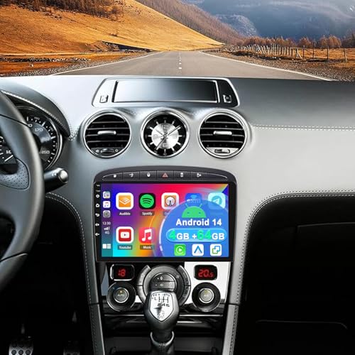 4+64G 2 Din Android 14 Autoradio Multimédia avec sans Fil CarPlay Android Auto pour Peugeot 308 2007-2015, 9 Pouces écran Tactile Radio Stéréo avec Navigation GPS FM Mirror Link SWC Wi-FI Bluetooth