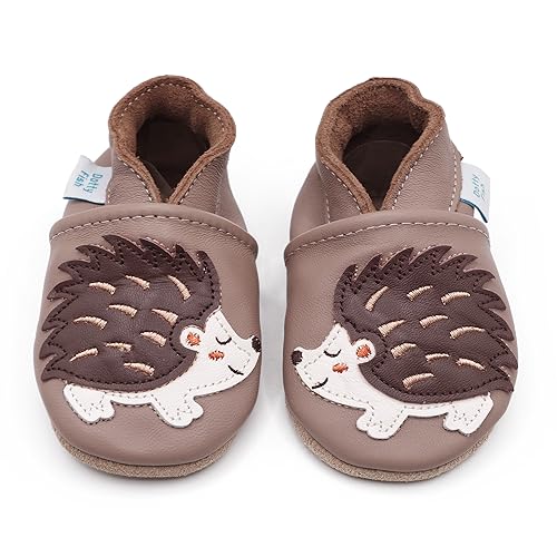 Dotty Fish Chaussures Pieds Nus Unisexes en Cuir pour bébés et Enfants - Antidérapantes, légères, Respirantes, Animaux du Zoo et de la Jungle. Garçons et Filles - Hérisson Brun Clair 12-18 Mois