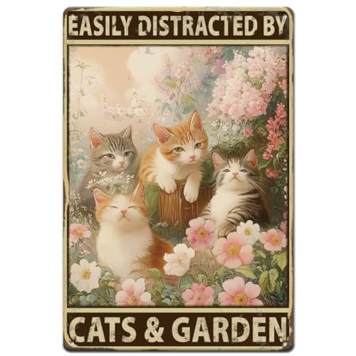 SUPERDANT Chats dans le Jardin Plaque Metal Vintage de Chat Mignons Plaque Murale Decorative Rétro pour Animaux Panneau D'Art de Campagne Vintage Facilement Distrait Par Cat&Garden Vintage Decoration