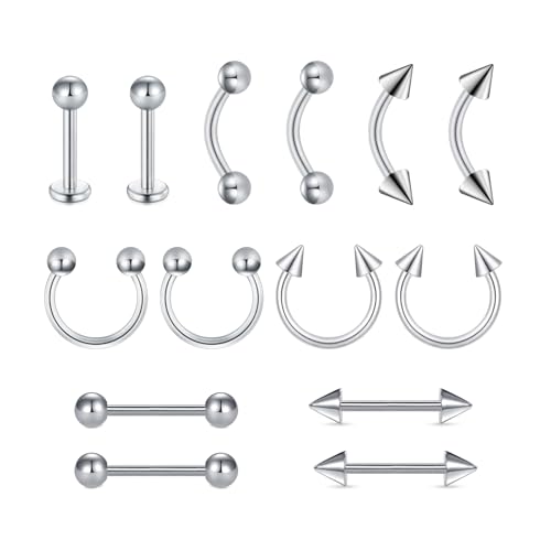 MODRSA Eyebrow-Bar Lip-Bar Septum Tongue-Piercing : 14 pièces 16G en Acier Chirurgical Barbell incurvé Anneau pour lèvre Piercing Tragus Argent