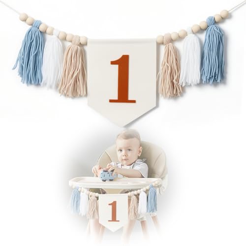 COLFULINE 1 Bannière Pour Chaise Haute, Bannière D'anniversaire Avec Perles En Bois Et Pompons, Décoration De Fête Bohème Faite Main À Suspendre Pour Décorer Un Anniversaire 1 An, Garçon Ou Fille